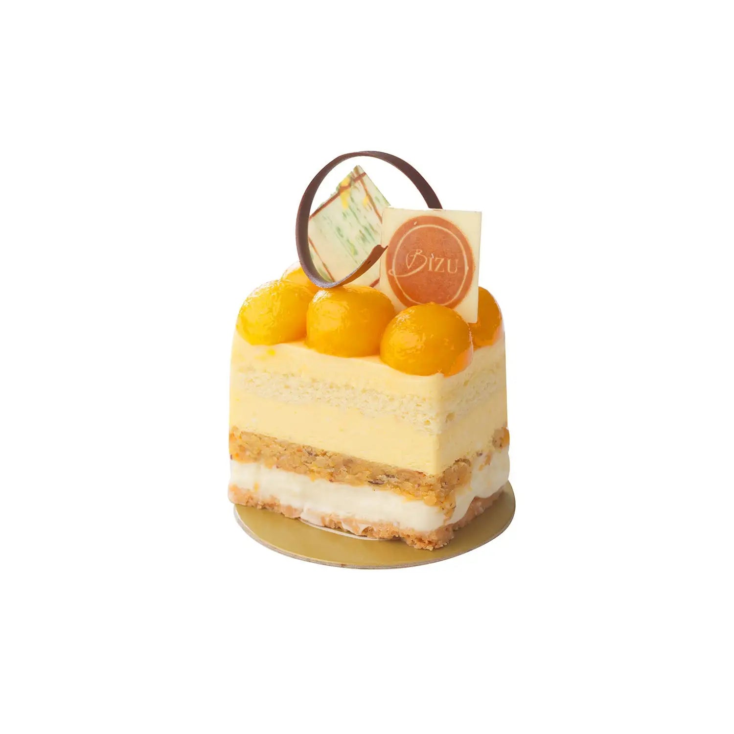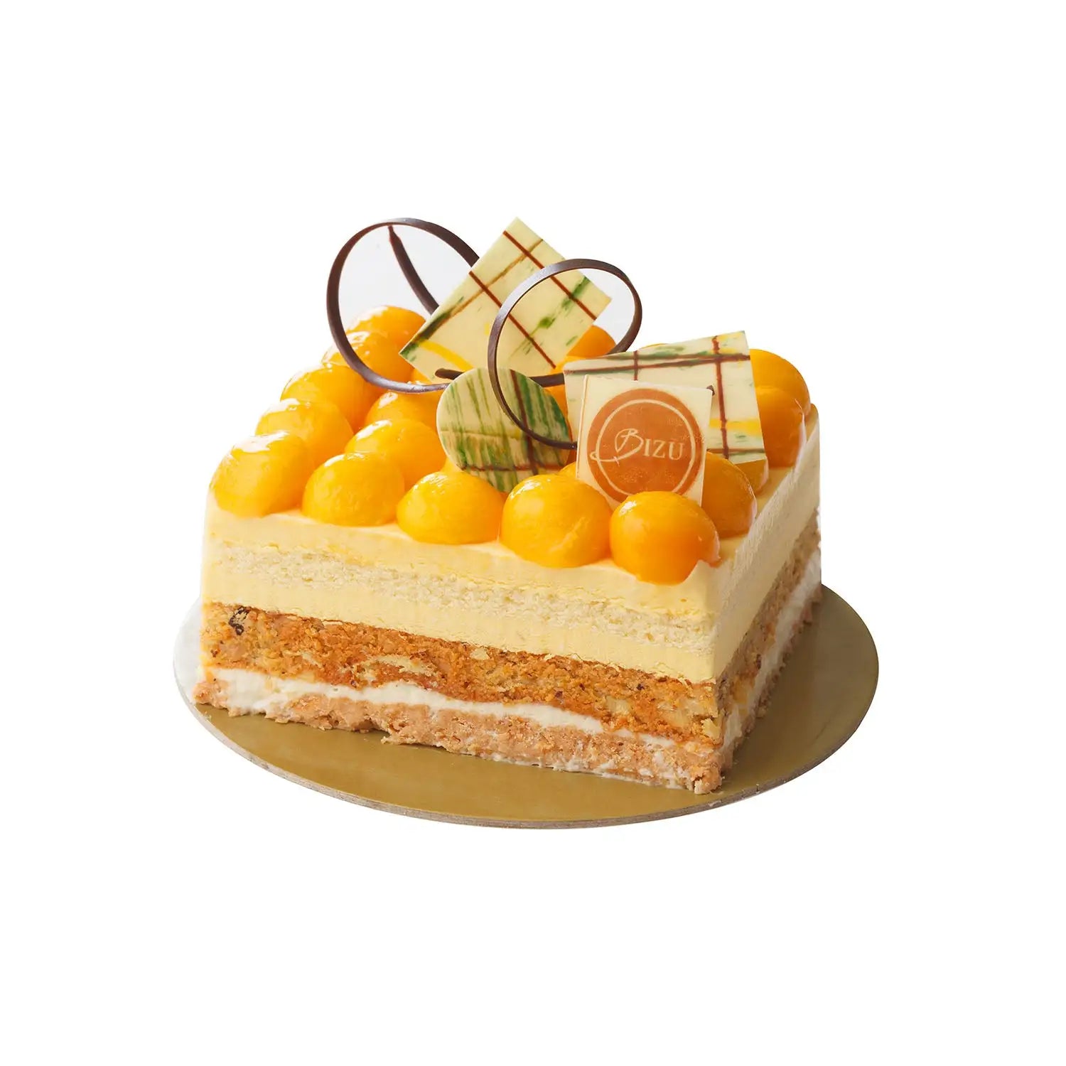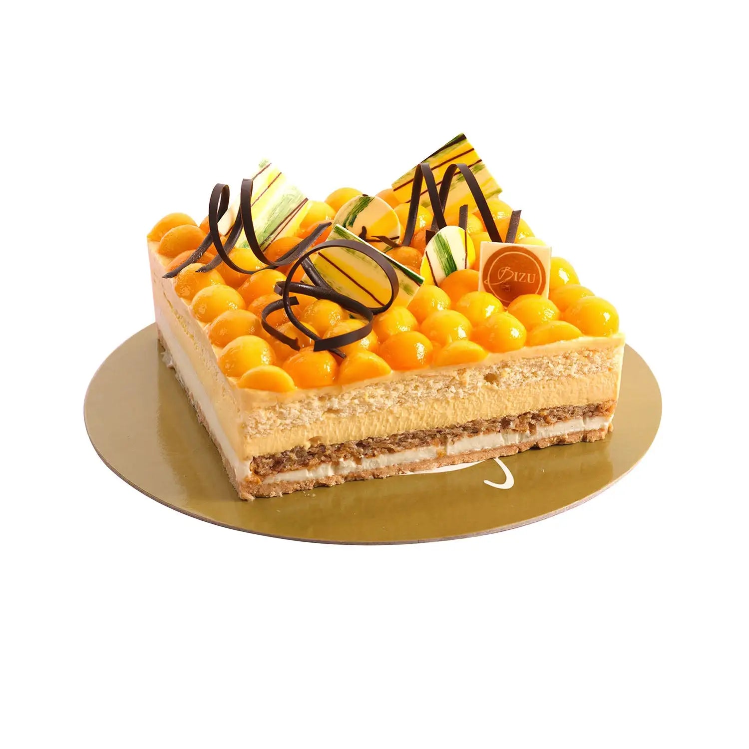 Refreshing layers of mango mousse with almond dacquoise, genoise sponge cake, coconut cream and crisp white chocolate croquantine. CAKE CARE INSTRUCTIONS:1....