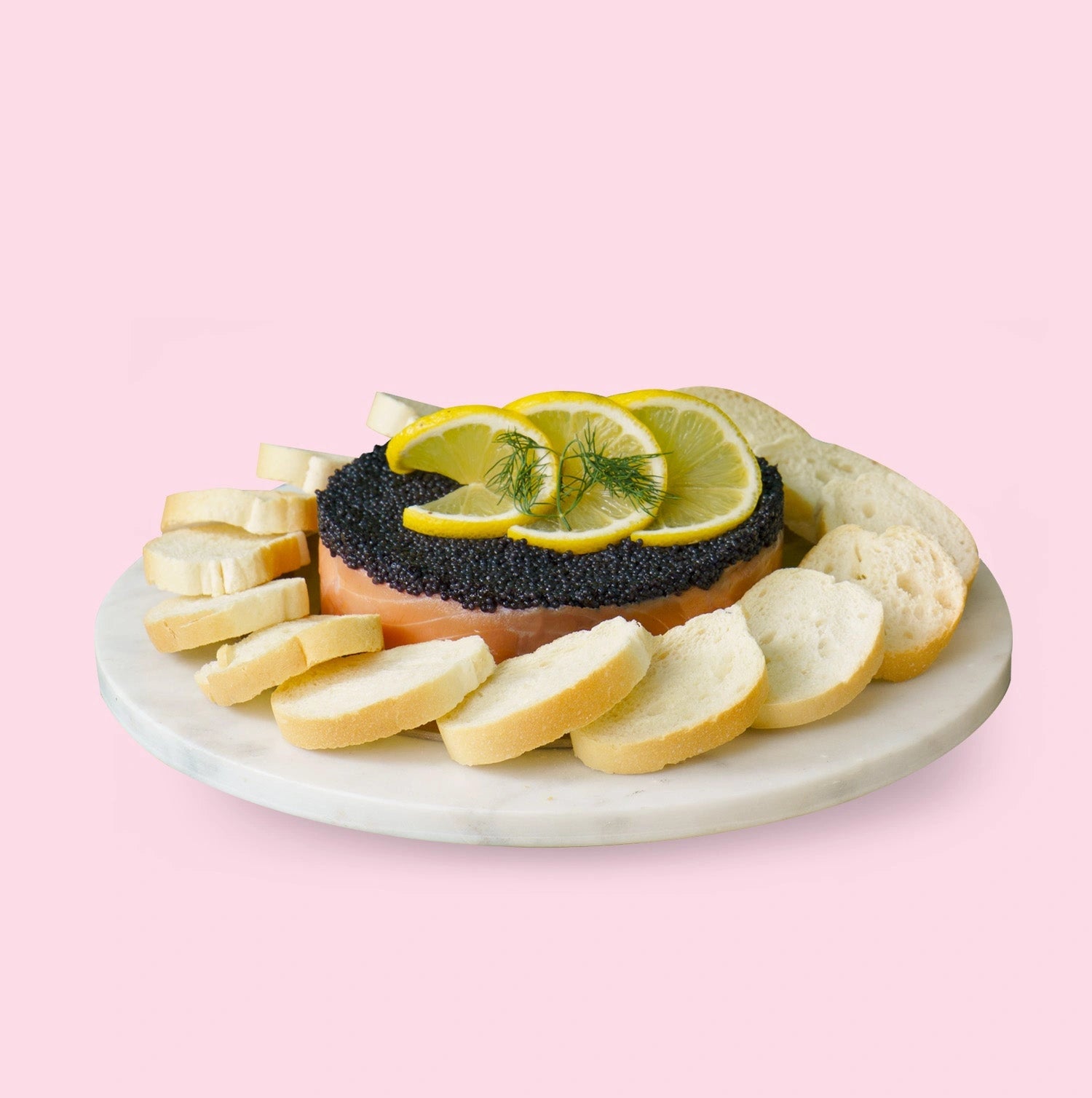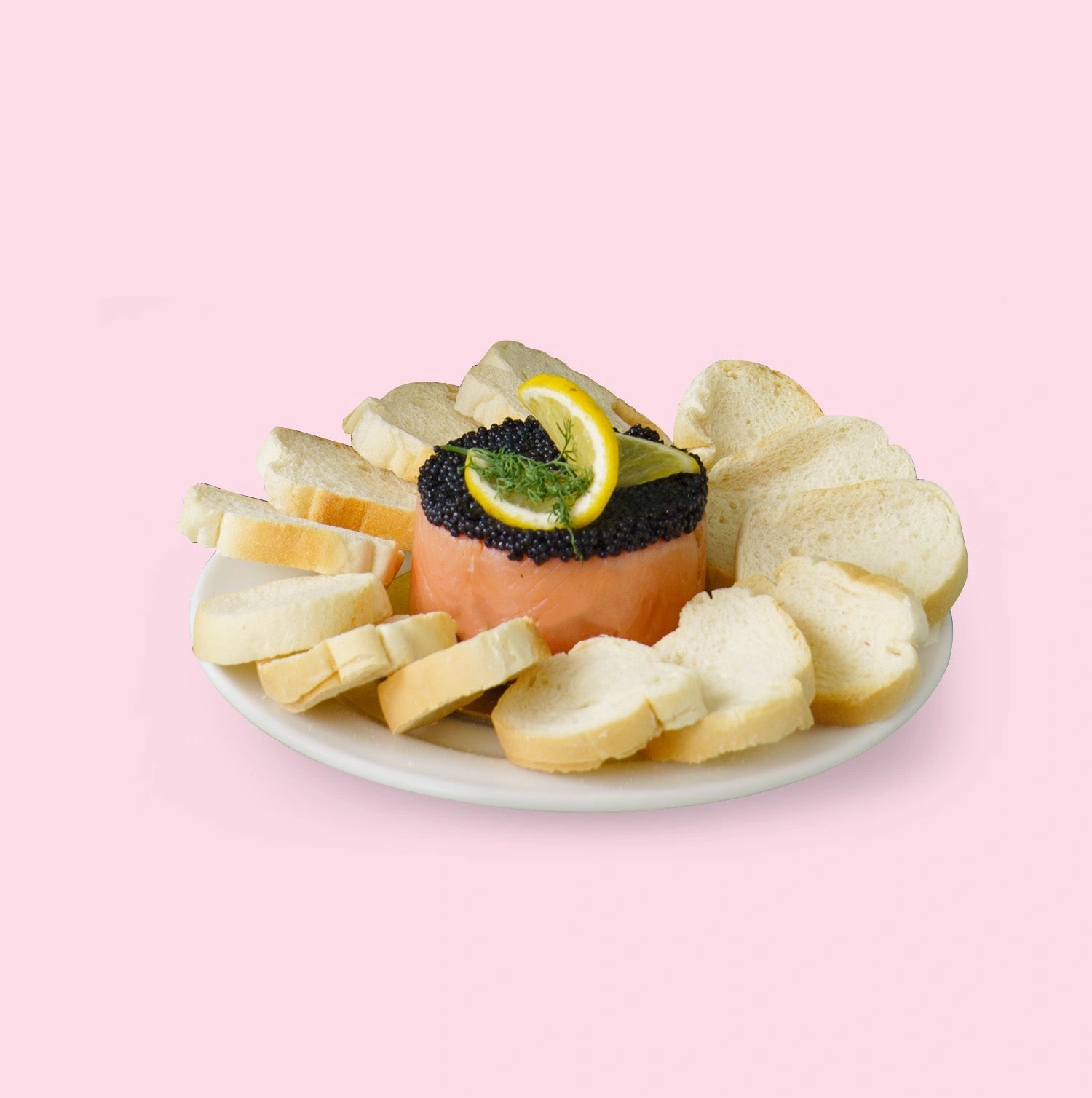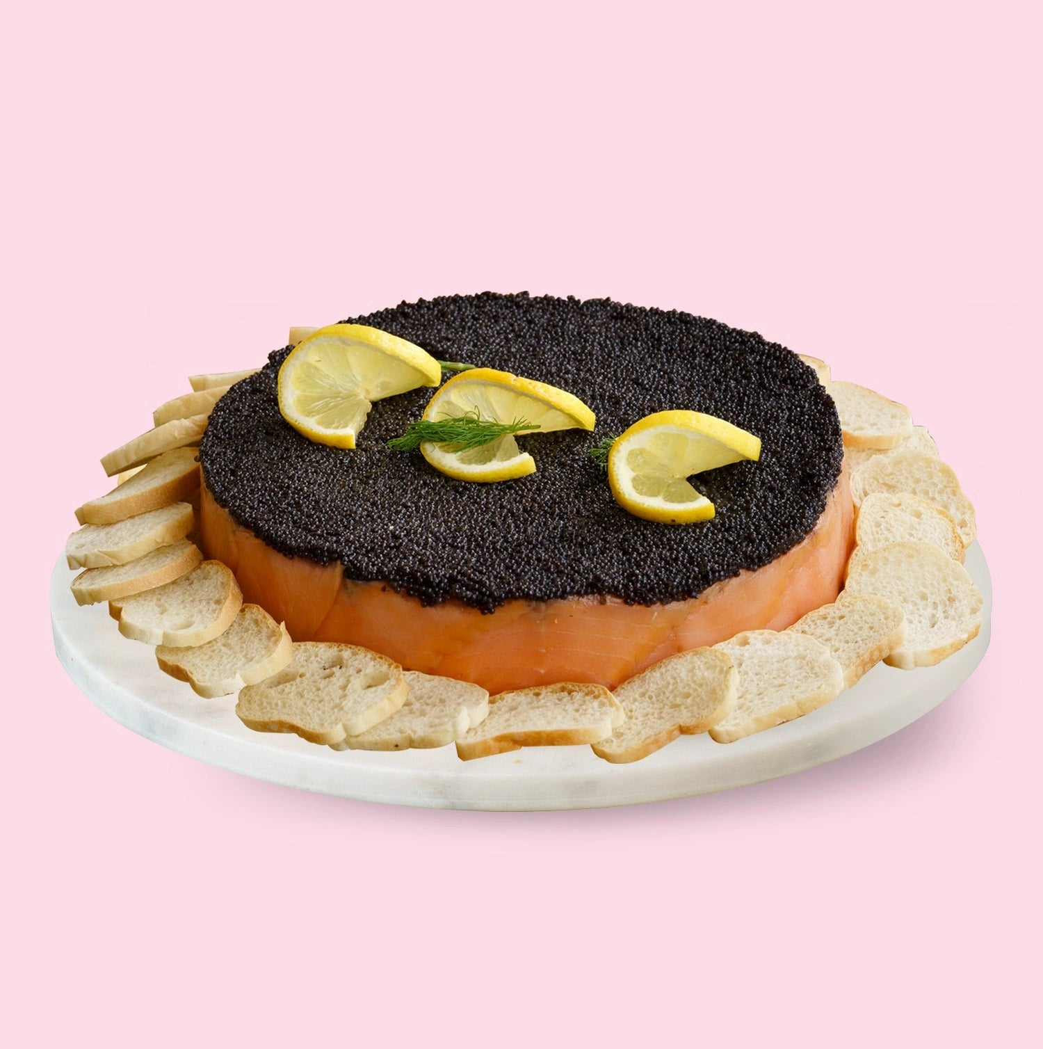 Norwegian Smoked Salmon topped with dill cream cheese & black caviar. Comes with crostini. Personal (3.5” diameter) (Good for 1...