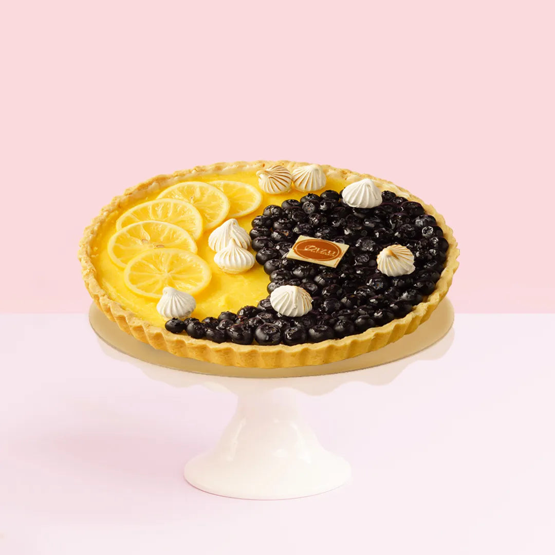 Traditional French tart filled lemon custard with mirroir glaze and candied Lemon topped with fresh blueberries and meringue kisses. Size:...