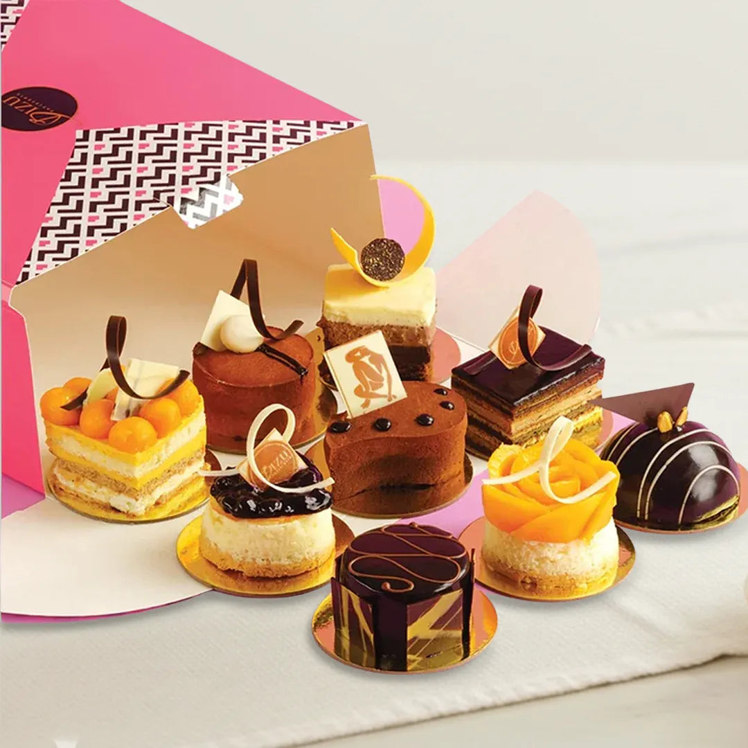 Special cake box of 9 delectable mini French gateaux made with the finest chocolates, almond sponge, fruits in season and...