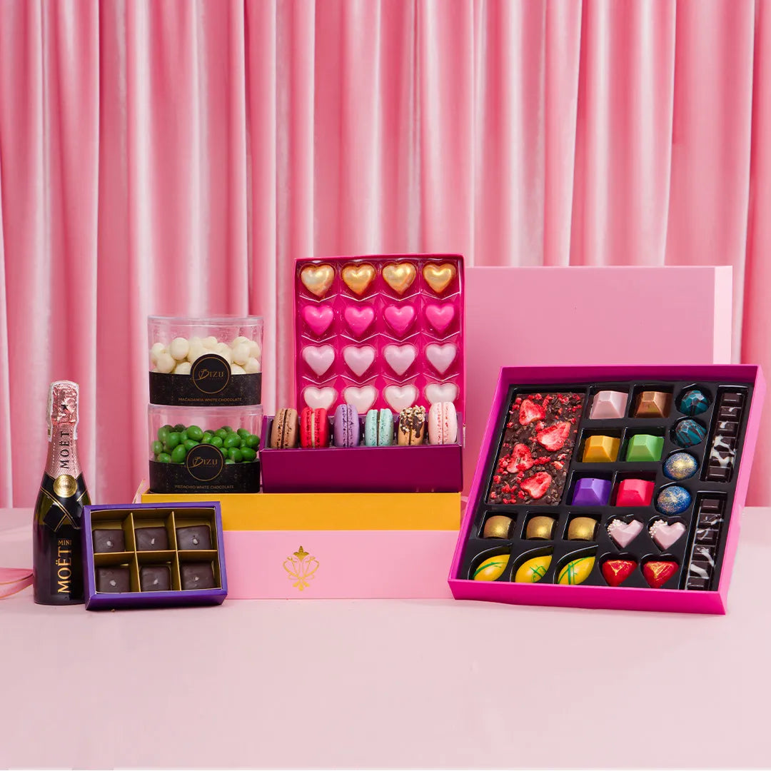 The Sweethearts Gift Box includes the following: 1 Moet Wine1 Bizu Special Box of 6 Assorted Macarons1 Pistachio White Chocolate1 Macadamia...