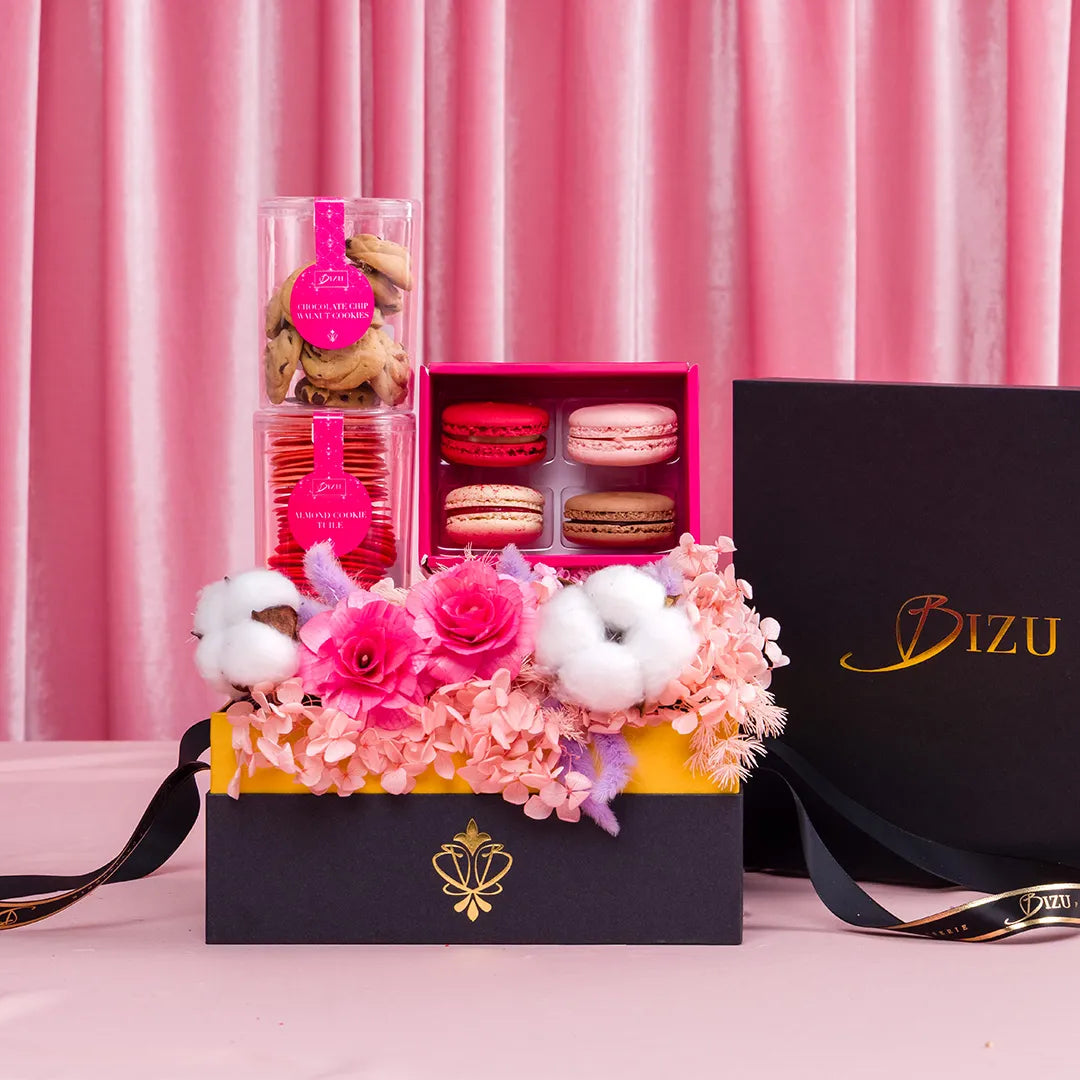 The Cherish Gift Box includes the following: 1 Moet1 Bizu Special Box of 6 Assorted Macarons1 Small Acrylic Box 1 Forever FlowersPink...