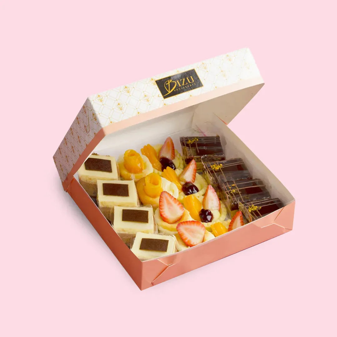 Inclusions: Opera CakeJolie Sugarless & FlourlessFresh Mango ChiboustStrawberry ChiboustFresh Fruit Tart16 pieces set Lead Time: 2 daysShelf life: Consume Immediately