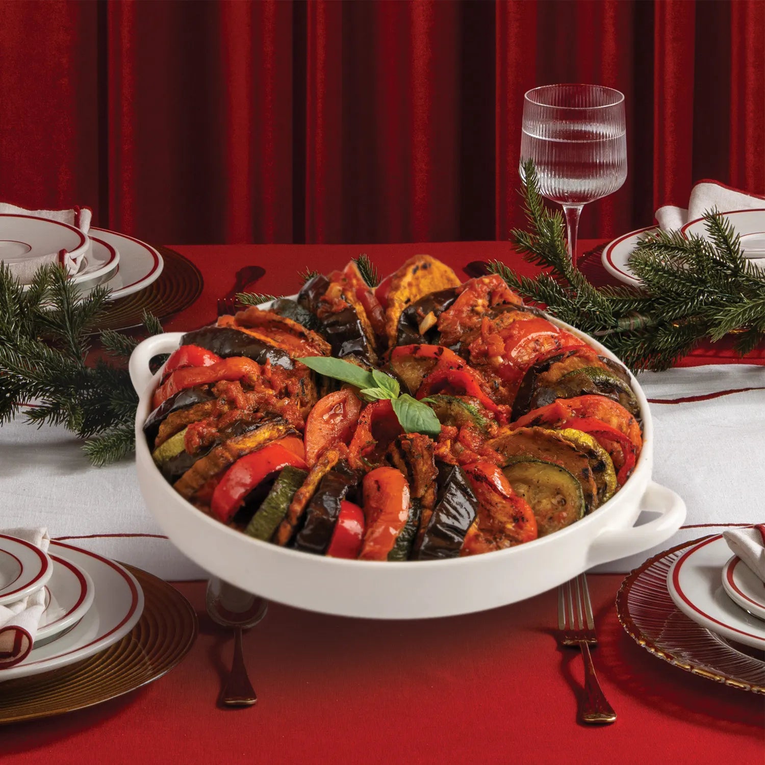 A colorful Provençal vegetable medley of layered eggplant, zucchini, squash, and tomatoes baked over a fragrant tomato and herb base,...