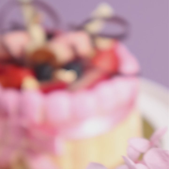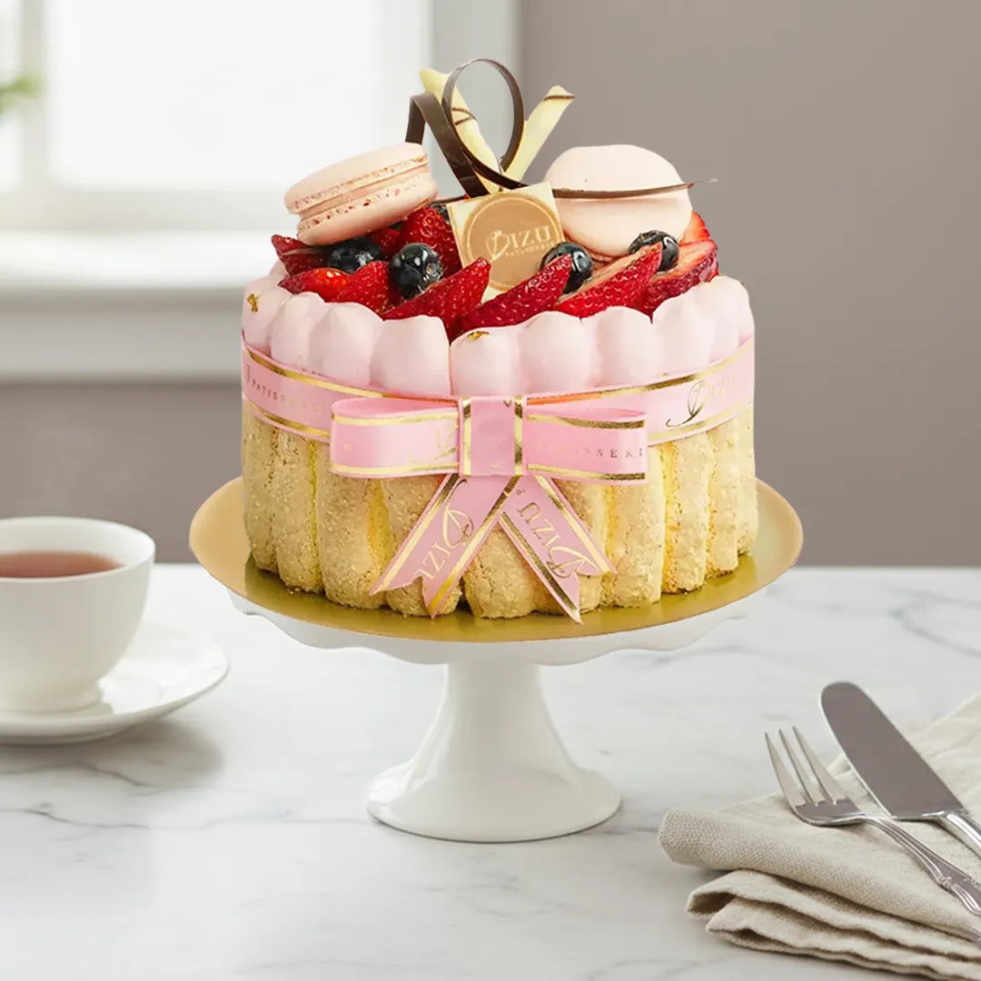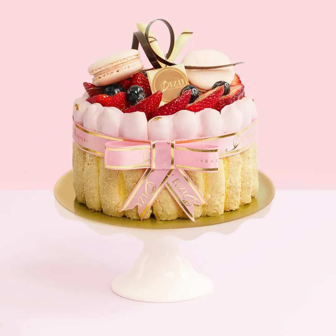 It's masterfully created with Biscuit Cuillère, alternating layers of blackberry mousse and raspberry gelée, topped with assorted fresh berries and petit Macaron de Paris.