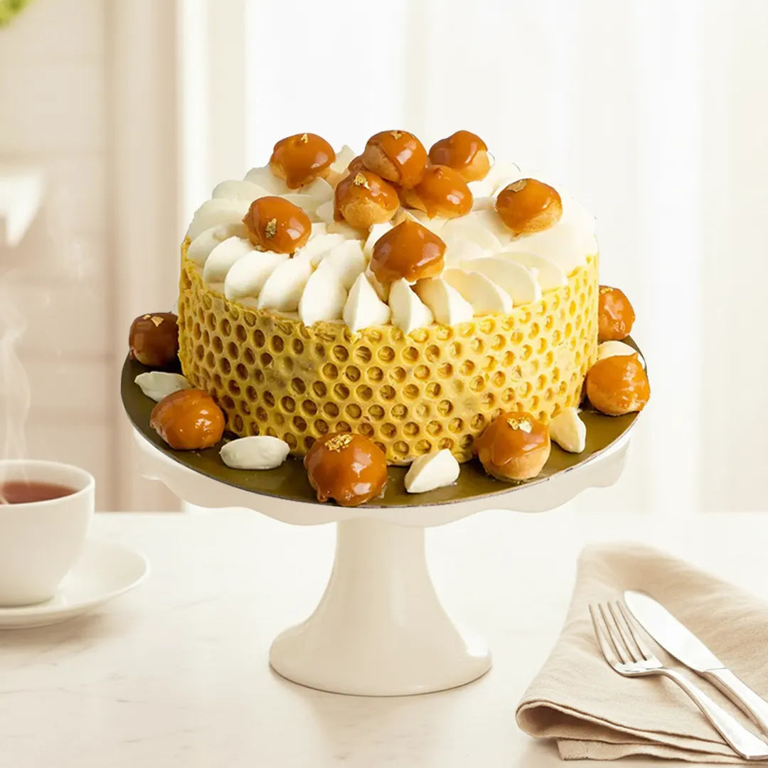 Layers of white chocolate mousse cake with honey-truffle oil, creme brulee and topped with crunchy pearls and soft profiteroles.
