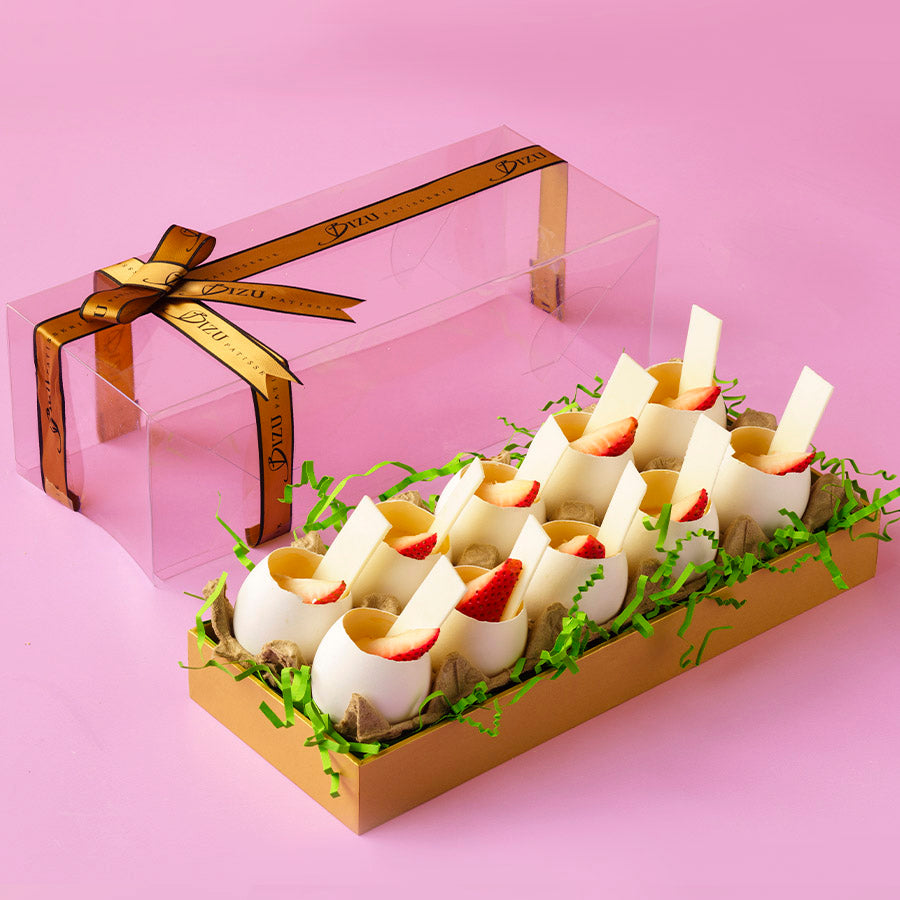 Smooth and creamy Vanilla Bean Crème Brûlée served in eggshells and topped with white chocolate and fresh succulent strawberries.