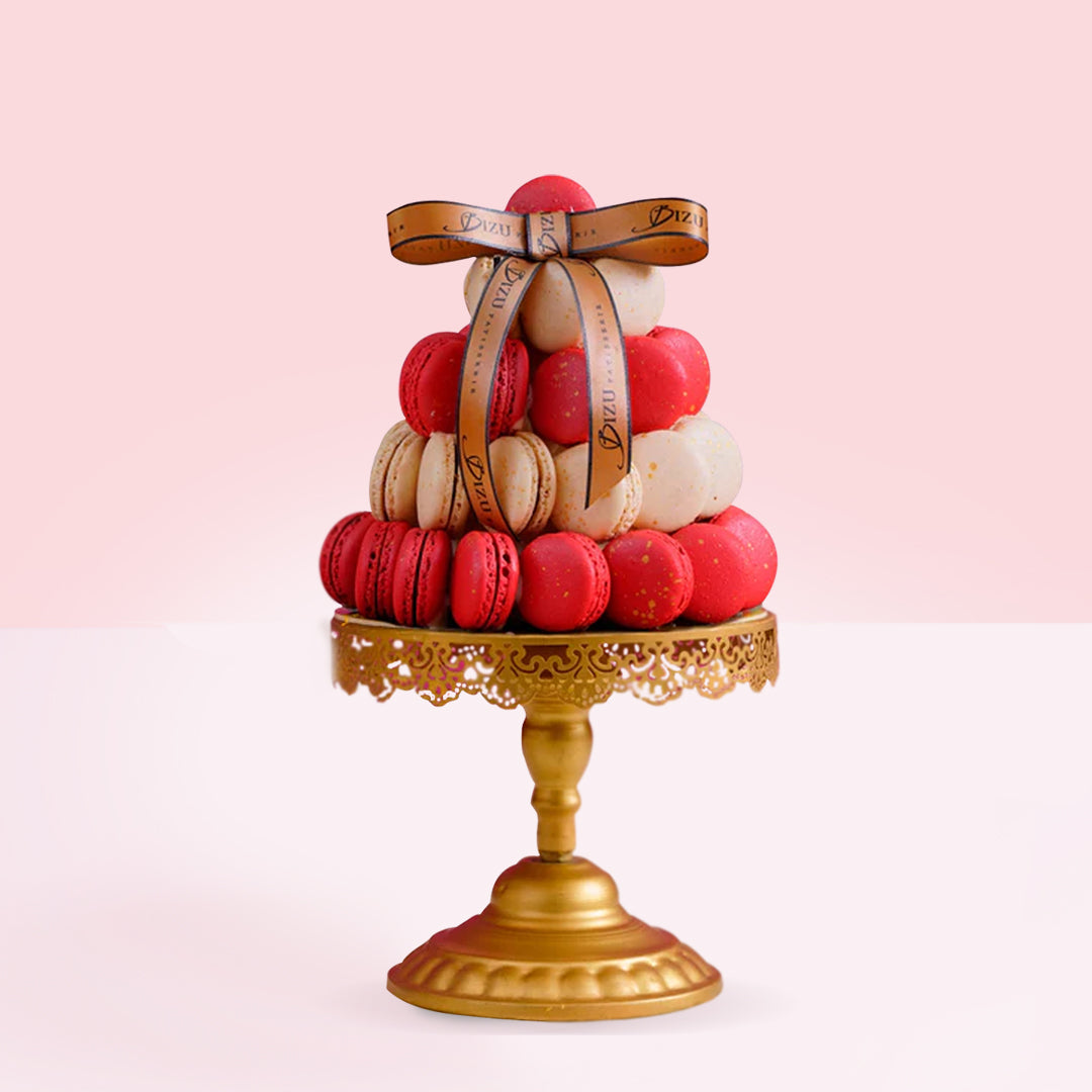 6 inches - Made with 40 pieces Bizu Macaron de Paris filled with chocolate ganache.