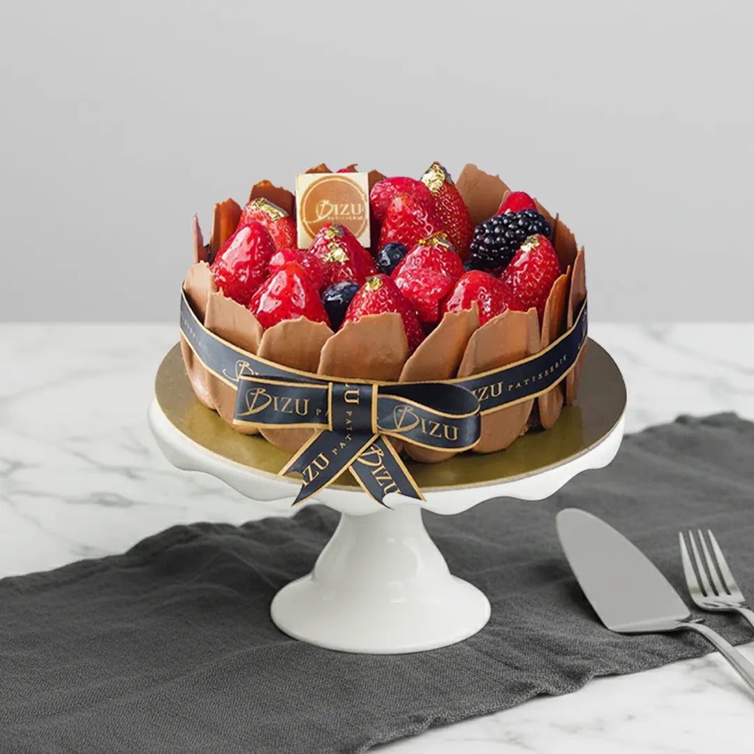 A guilt-free indulgence made of creamy ganache of sugar-free dark chocolate on top of a gluten-free dacquoise crust, and it's crowned with sweet fresh berries. Every inch is meticulously wrapped in delicate sugar-free dark chocolate.