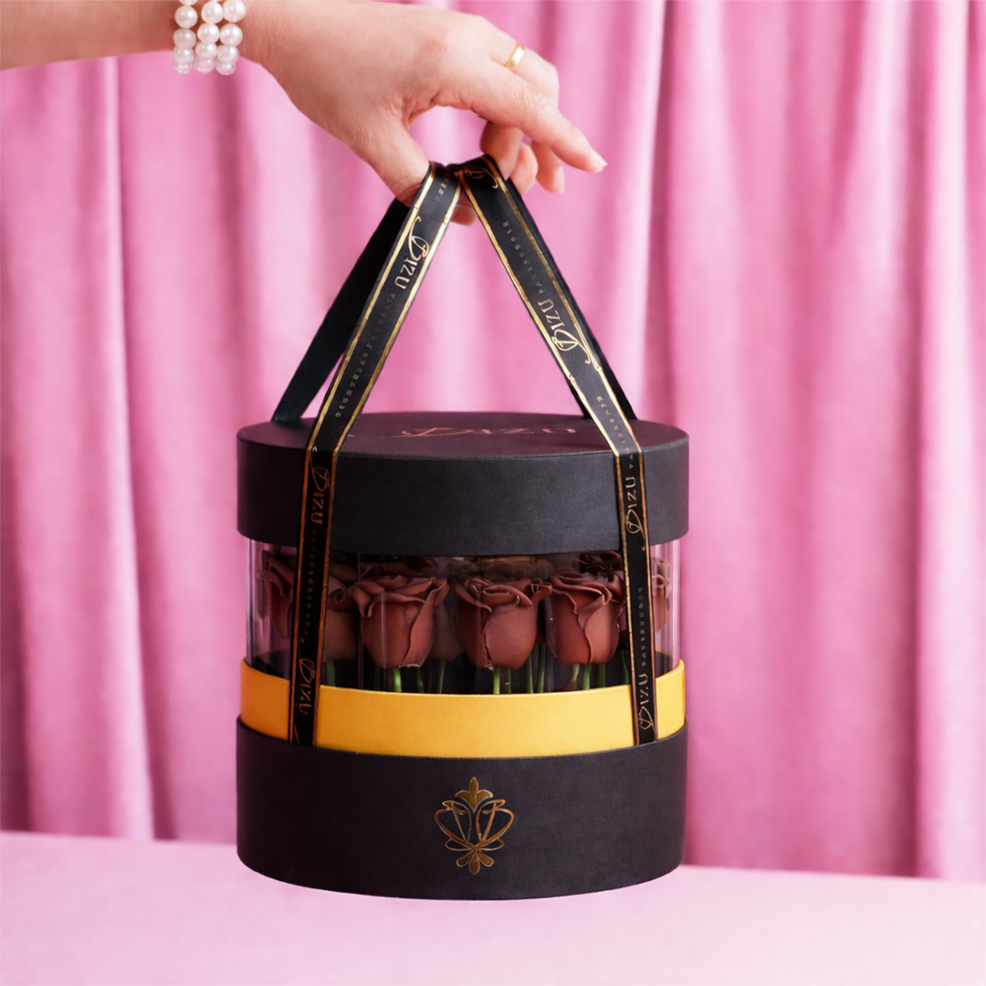 14 handcrafted roses in Valrhona Jivara 40% — a creamy milk chocolate with pronounced cocoa notes, a hint of vanilla, and a smooth malty finish.