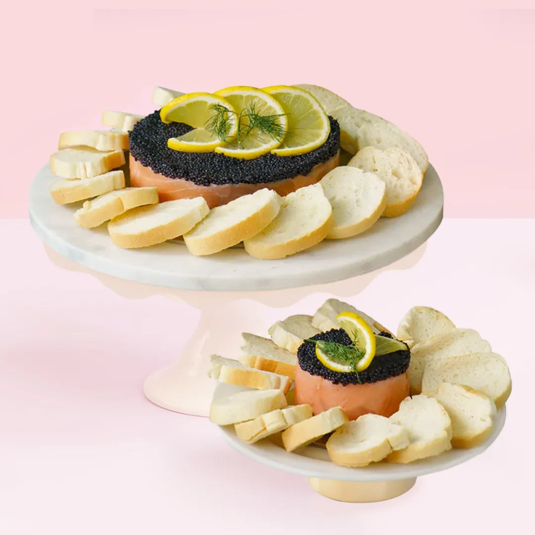 Norwegian Smoked Salmon topped with dill cream cheese & black caviar. Comes with crostini.